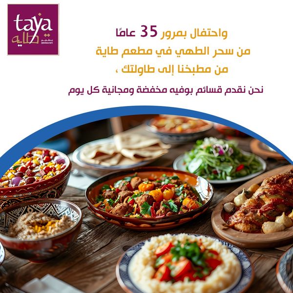 عرض البوفيه وتخفيضات متنوعة عند طلب اون لاين عبر الموقع .. واحتفال بمرور 35 عامًا من سحر الطهي في مطعم طاية، من مطبخنا إلى طاولتك!..